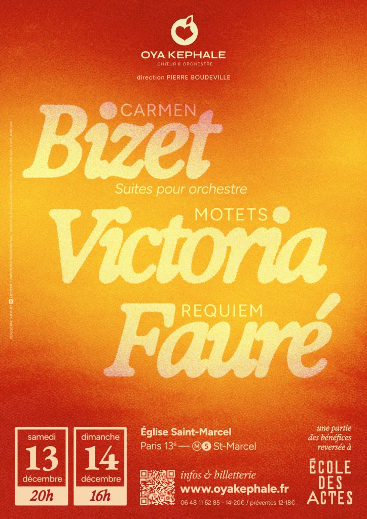 En cette fin d’année, le rendez-vous est honoré : l’association Oya Kephale nous convie pour un concert en l’église Saint-Marcel pour un programme franco-espagnol. L’organisation en est toujours la même : une première pièce où l’orchestre joue seul, puis le chÅ“ur seul avant que tout ce beau monde ne se rejoigne pour la grande pièce du concert. Cette année donc, nous partons pour l’Espagne fantasmée de Bizet avec les deux suites tirées de Carmen (arrangées par Ernest Guiraud), puis la vraie Espagne avec des motets du compositeur de la renaissance Tomás Luis de Victoria. On quitte par contre totalement la péninsule ibérique pour terminer avec Gabriel Fauré et son Requiem. Comme tous les ans, les concerts sont montés au profit d’une association : l’École des Actes. Cette association a pour but d’apporter un soutien en formation notamment aux plus précaires pour les aider à se professionnaliser. Alors que l’année dernière, le format avait été modifié, donnant de la visibilité à tous les ensembles de chambre issus d’Oya Kephale pour un concert unique, on retrouve donc l’organisation habituelle. Continuer…